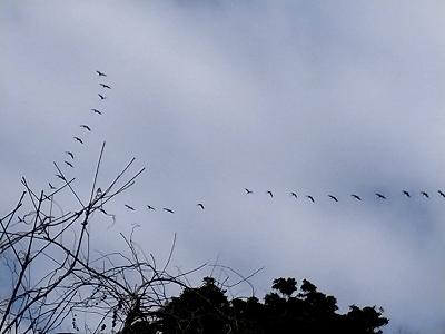 ーギャーうるさい。ふと目を上げると鶴の北帰行!である。とっさにスマホを向けるもなかなか