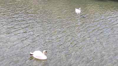 よしはら橋がかかる川では2羽の白鳥が出迎えてくれた。ナフコ畔刈店辺りから石段を登