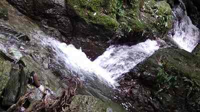 て、自称乙女の滝に着いた。あまりに水量が多く、ちょっと渡れそうにない。仕方なく沢の横の道なき道を