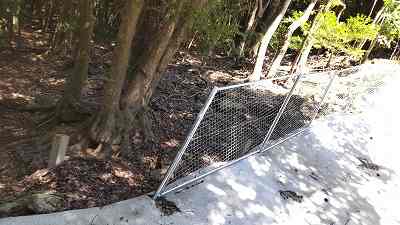 ムを見て元宮公園から寺岳へ。登山口のイノシシ防止柵が逆から開閉するようになっていた。でも柵のあちこちにでかい穴が、