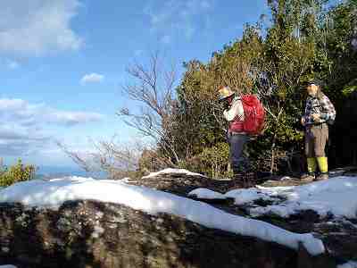 雨の不安がありつつA班3名で元宮公園口スタート。前日までの雪で、寺岳に着くまでの山道には