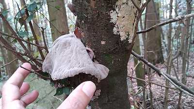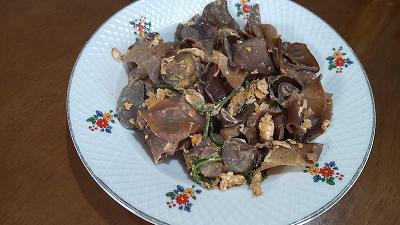 から山道に入った。その辺りで木耳の密生があり収穫祭!その後も何か所かで収穫し、帰宅後に同時に収穫した