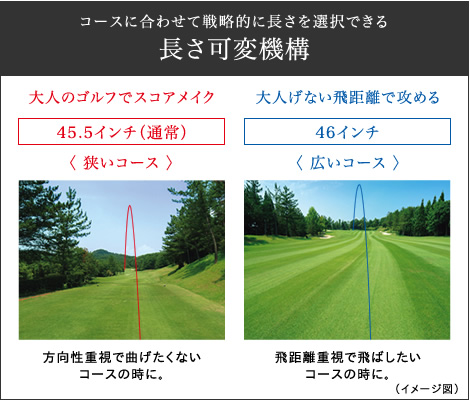 フェースアングル、ライ角の調整機能に加え、長さを45.5インチ(通常)と46インチの2通りから選べます。