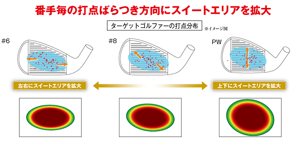 ![]() ヘッドスピードアップテクノロジー シャフト先端軽量化により30mmも手元重心化した 「SP-700」カーボンシャフト(アイアン用)を装着。 クラブ重量を従来モデルより1g軽量化することでクラブの慣性モーメントを小さくし、 振り易くなったことでヘッドスピードがアップします。(数値は6番アイアン) ボールスピードアップテクノロジー 1) ヘッドの運動エネルギーがアップ 従来モデルよりもヘッド重量を2g増加させることで、 インパクト時にボールに伝わる運動エネルギーがアップし、 ボールスピードがアップします。(数値は6番アイアン) 2) 平均ボールスピードがアップ シニアゴルファーの打点に合わせた番手別新フェース肉厚設計により スイートエリアを拡大し、平均ボールスピードがアップしています。 ![]() ![]() 楽にボールが上がって飛ぶ 全番手でヘッドの深・低重心 キャビティソール部の重量を増加させることで、 ヘッドの重心がさらに低く、深くなりました。 これにより、全番手でボールが上がりやすくなっています。 ミスヒットでの飛距離ロスを軽減 タングステンニッケルのネックとソールウエイトで重量を周辺配分し、 慣性モーメントを拡大しました。 オフセンターショットで当たり負けない安定性を実現しています。 ![]() 高級感がさらに進化 品位の高いゴールド系カラーにより、 すみずみまで統一感ある外観仕上げとなっています。 ウッドのボディは高輝度メタリック塗装でグリーンからブラウンへの グラデーションとなっており、フェースとソールはゴールドイオンプレーティングです。 |